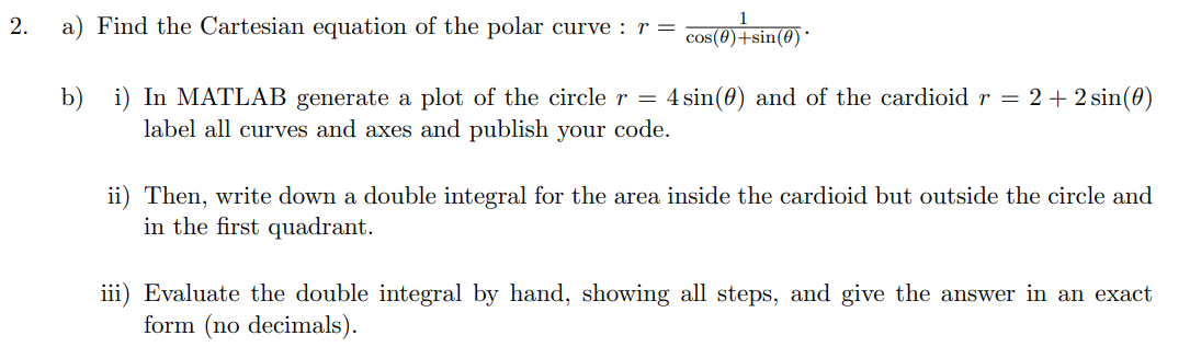 Graphing Polar Equations in Matlab - Redwoods Matlab's POLAR Command. Consider the polar equation. r = cos 2 θ, called the four-leaf rose. We can use Matlab's polar command to plot the graph of this equation on [ 0, 2 π]. First, use Matlab's linspace to generate 100 equally spaced points on the interval [ 0, 2 π], then generate the corresponding r -values.